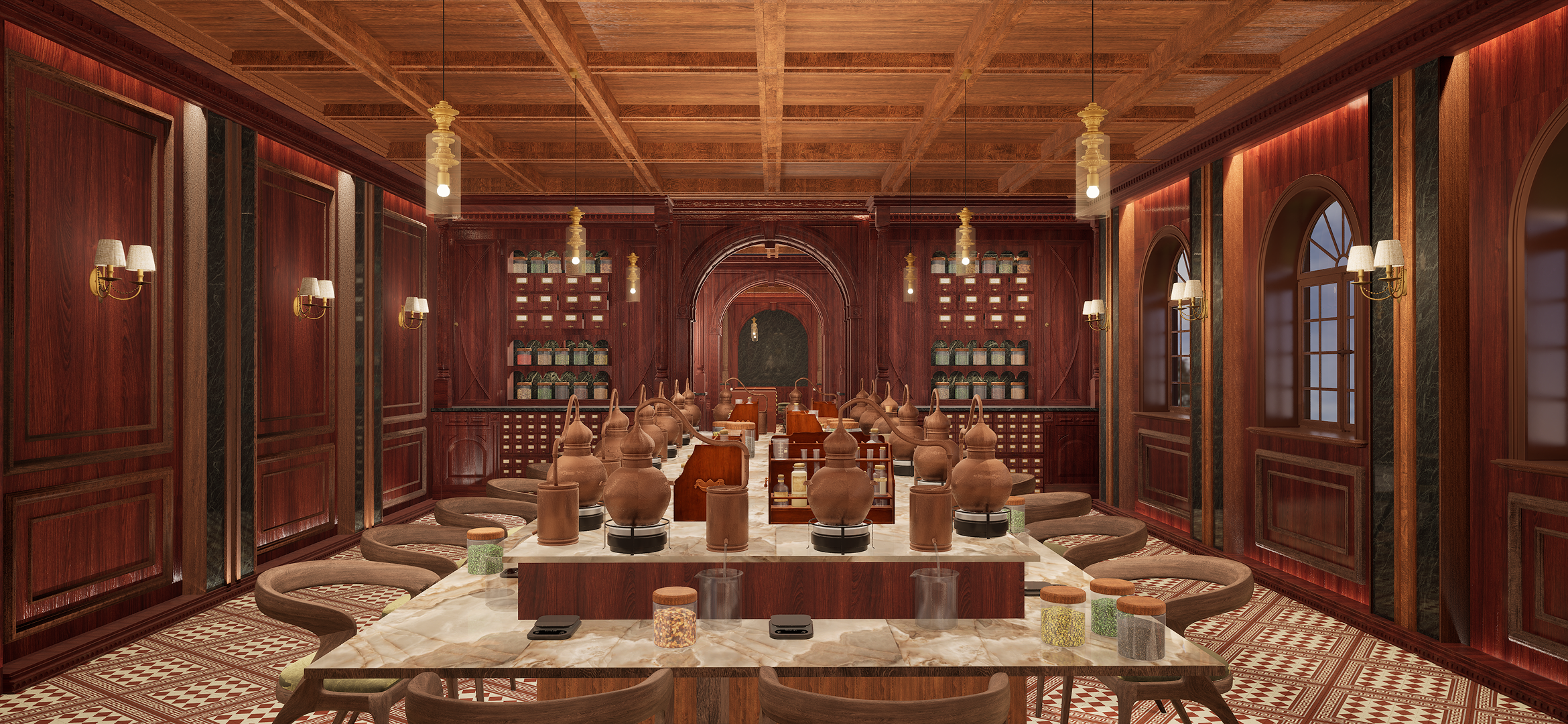 Inspired by gin’s origins as a medicinal remedy, the workshop area weaves apothecary nostalgia with wooden arches and marble surfaces, creating a warm, richly immersive environment that evokes curiosity and the quiet magic of craft.
