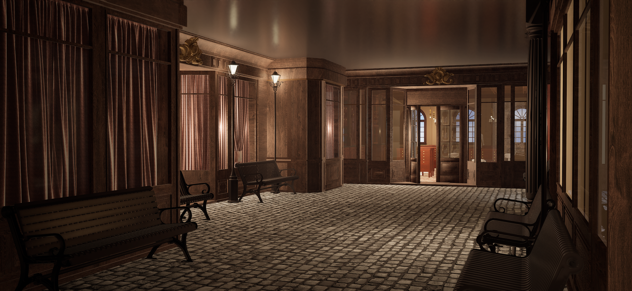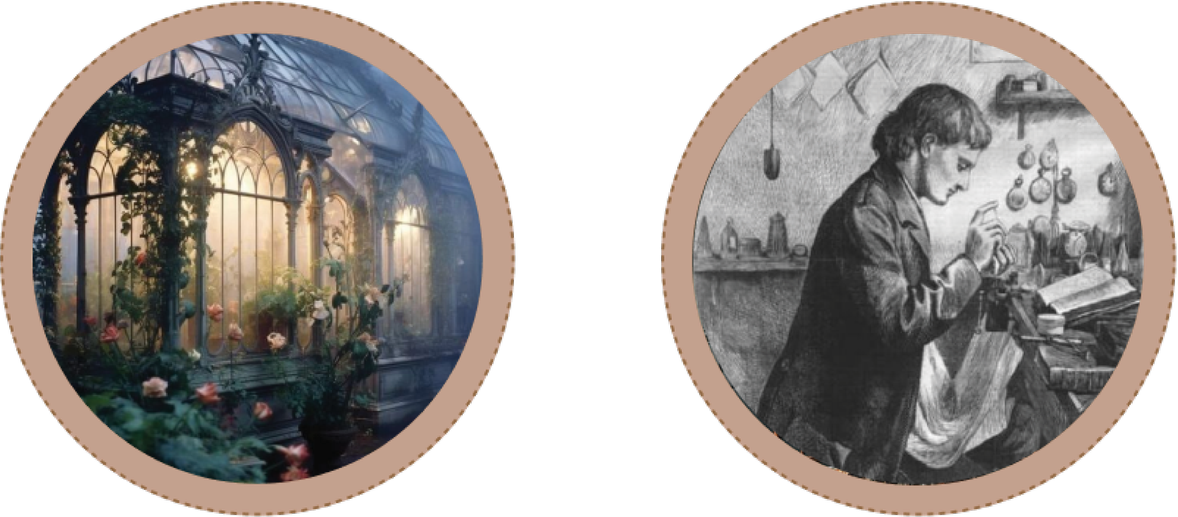 The reception lounge reimagines a Victorian glass garden. Floral chandeliers, wall coverings, and layered greenery create a dreamy, intimate mood. A soft transition through the tunnel leads guests deeper into a world of the Victorian era's mysterious, surreal charm.