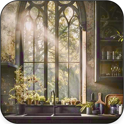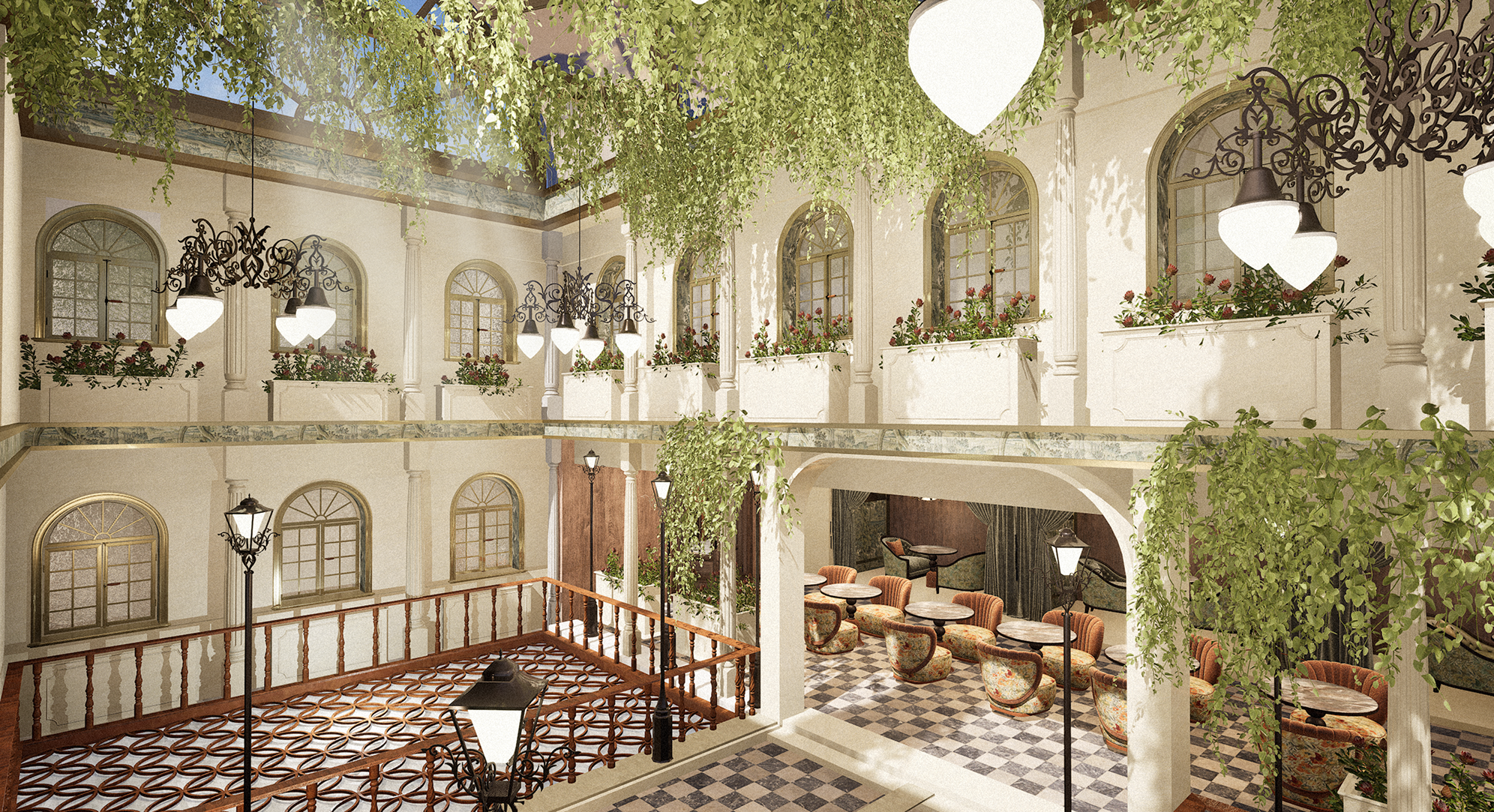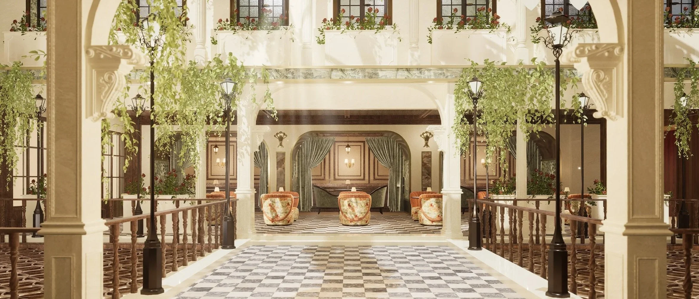 Indoor courtyard reimagines a tranquil Victorian street, where cascading greenery, vintage street lamps, and ornate railings create a romantic, indulgent escape immersed in blooming serenity.