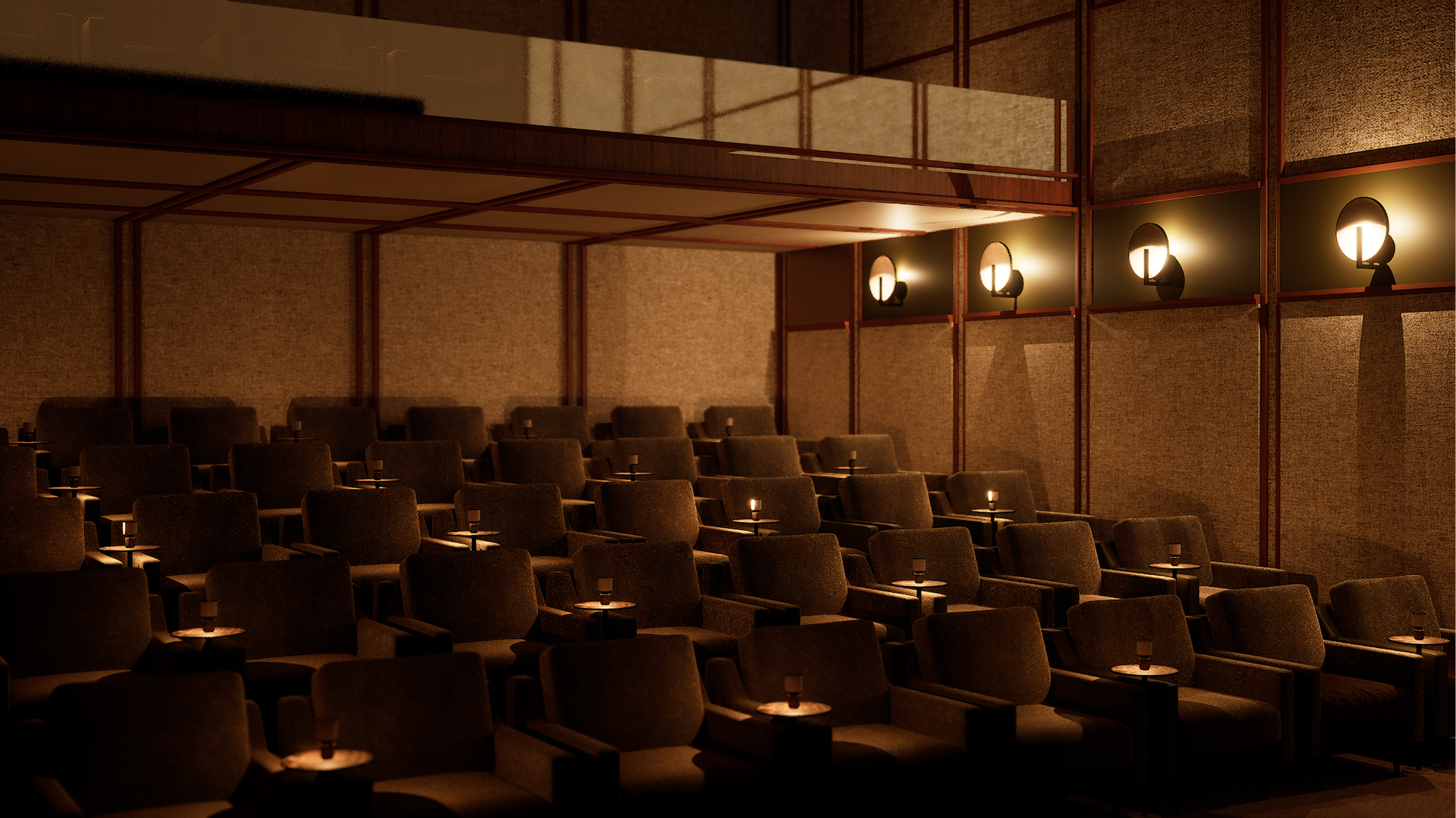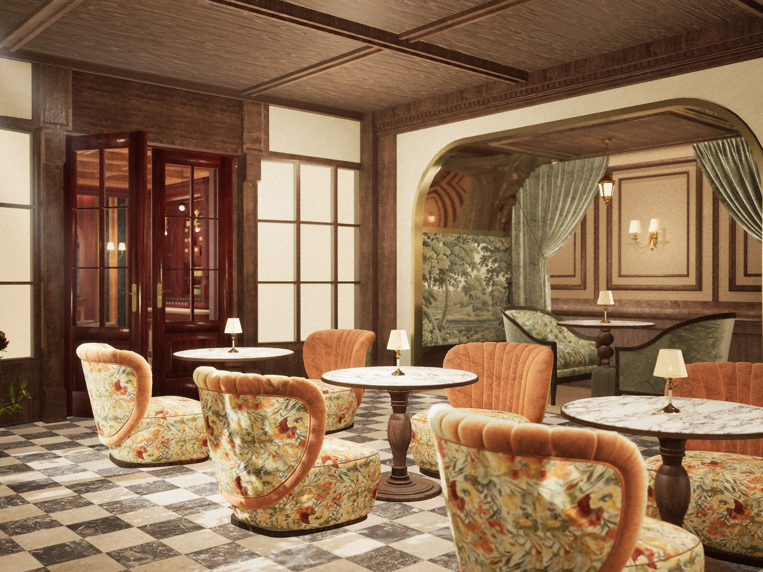 The bar evokes a dreamy and inviting glasshouse atmosphere layered with greenery, rich textures, and soft backlit ceilings. It’s a space of warmth and quiet discovery, where patterns and plants create a sense of depth and wonder.