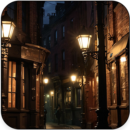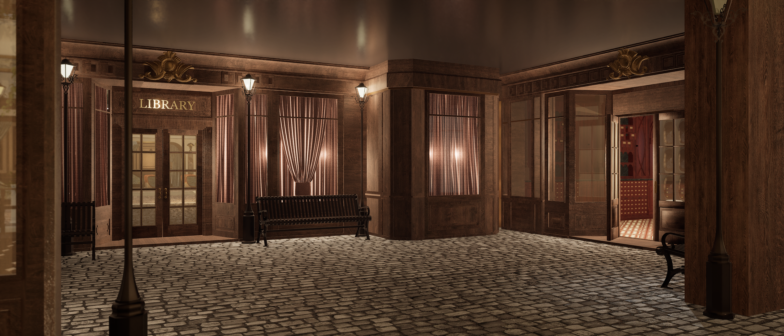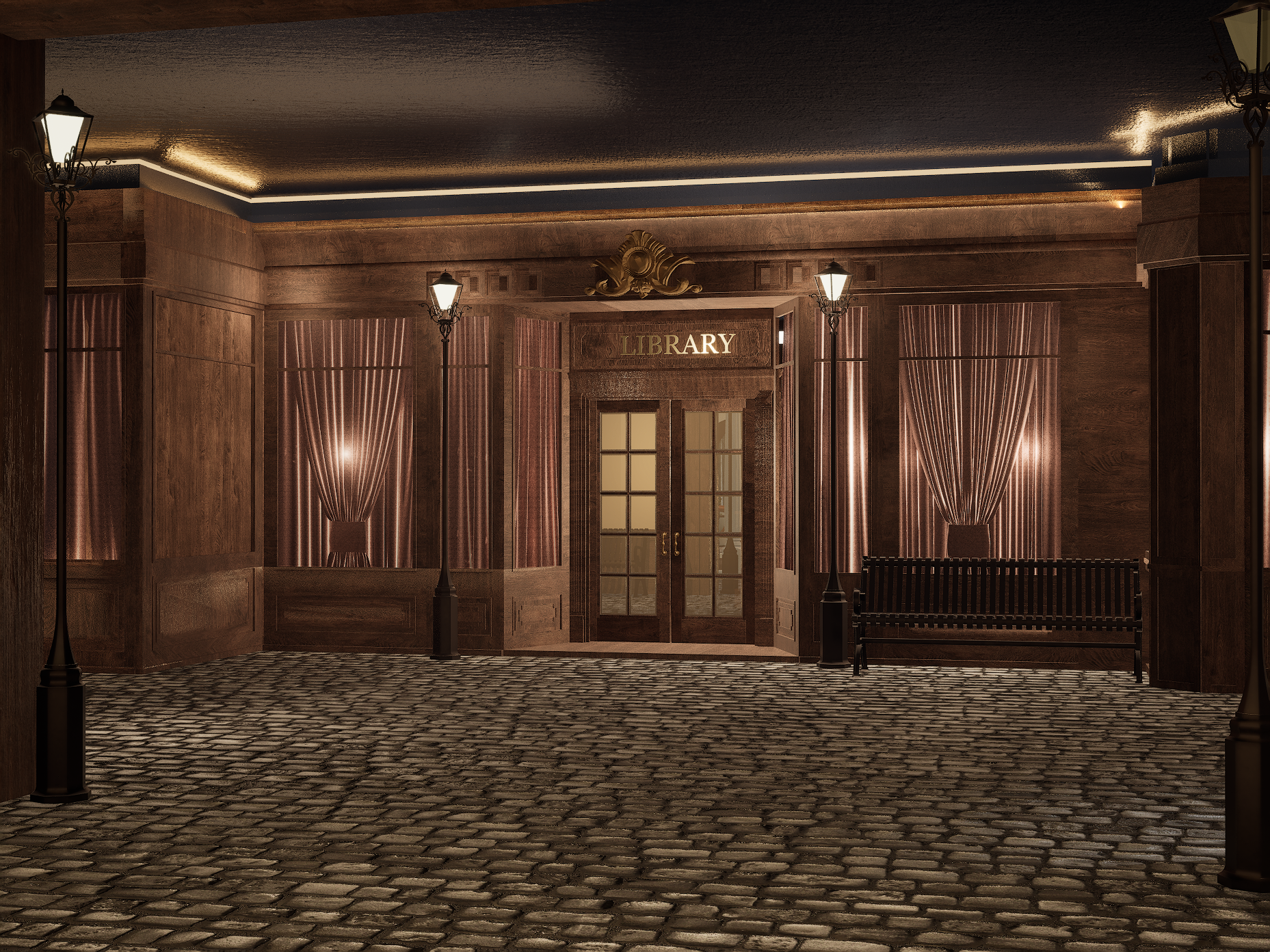 Contrasting with the bright indoor courtyard, this dark, enclosed reimagined Victorian street sets a moody tone with cobblestone floors, warm lighting, and rich wooden facade. Each storefront invites guests into an intimate, nostalgic world. A sanctuary of knowledge, craft, and creativity.